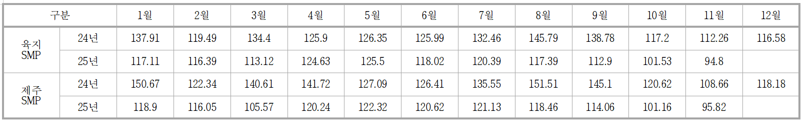 - 25년도 평균가격 : 71,908원/1,000kWh(12월 현재까지 가격 감안)