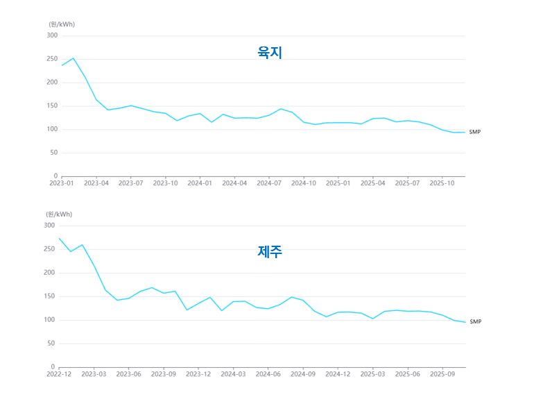 - 육지는 약 15원/kWh이 하락하였습니다.