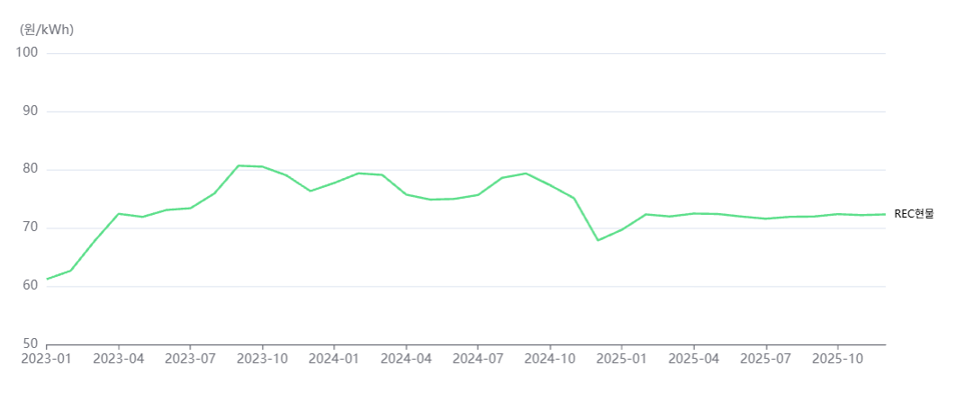 - REC 역시 24년에 비해 25년에 하락은 했지만, 실제로 25년도 가격은 월별로 거의 72,000원대로 유지중에 있습니다.